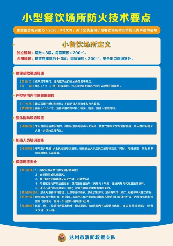 近日,国务院安委会办公室发布关于坚决防范遏制小型餐饮场所群死群伤火灾事故的通知,要求各地区组织小型餐饮场所开展自查自改,对照国家消防技术标准和《小型餐饮场所防火技术要点》,